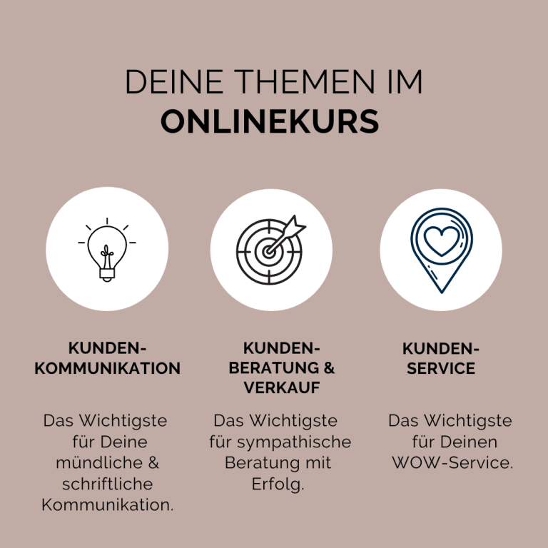 Das Wichtigste aus Kommunikation, Verkauf und Service-Betreuung in einem Onlinekurs kompakt für Dich zusammengefasst.